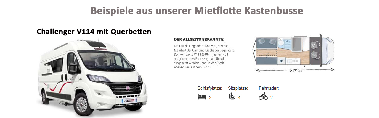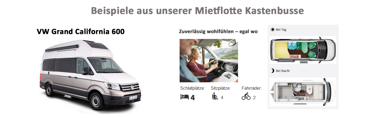 Fahrzeug: Eine Wohnmobilreservierung erfolgt immer auf eine Fahrzeugkategorie, niemals auf ein bestimmtes Fahrzeugmodell/Grundriss.